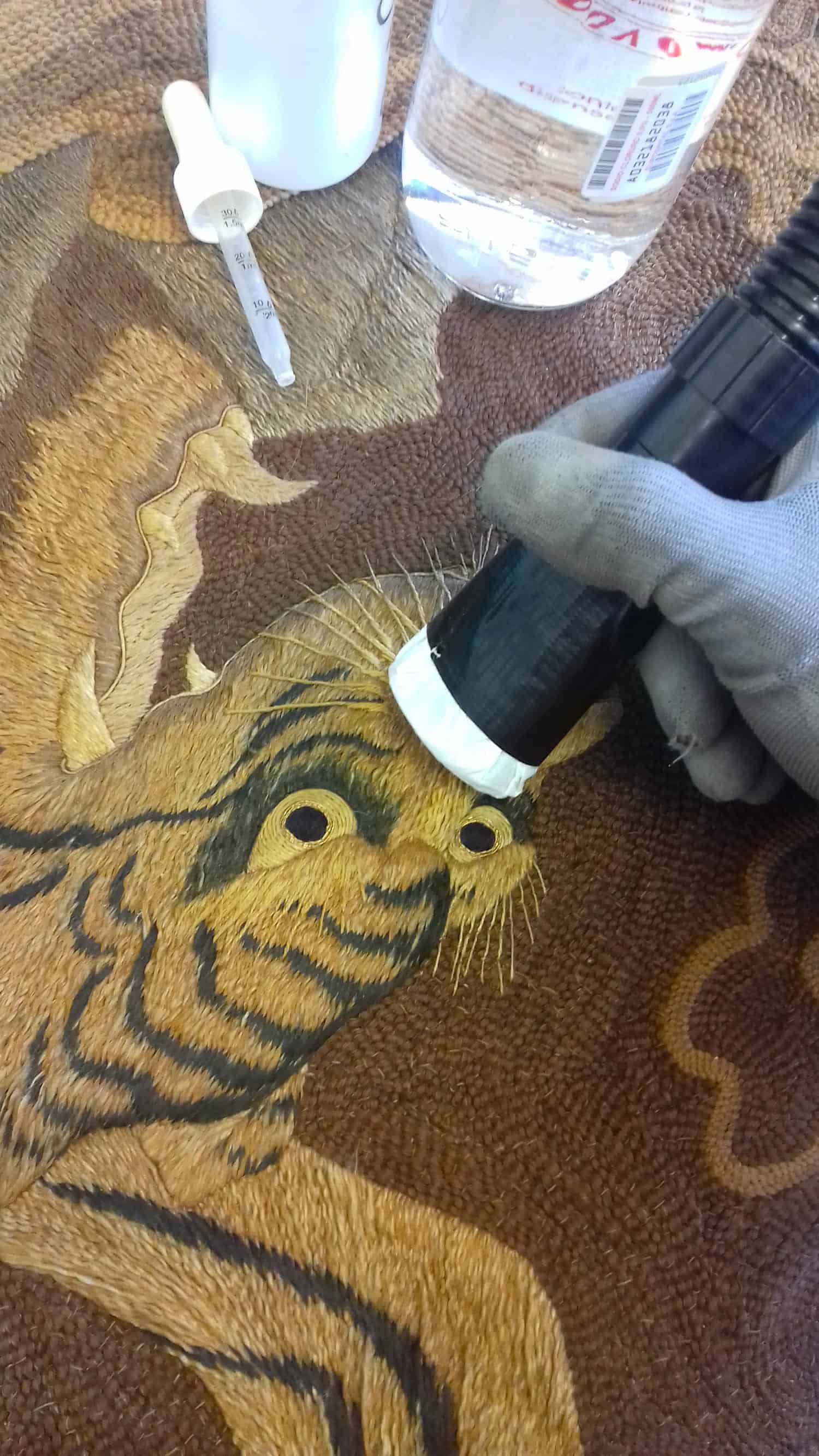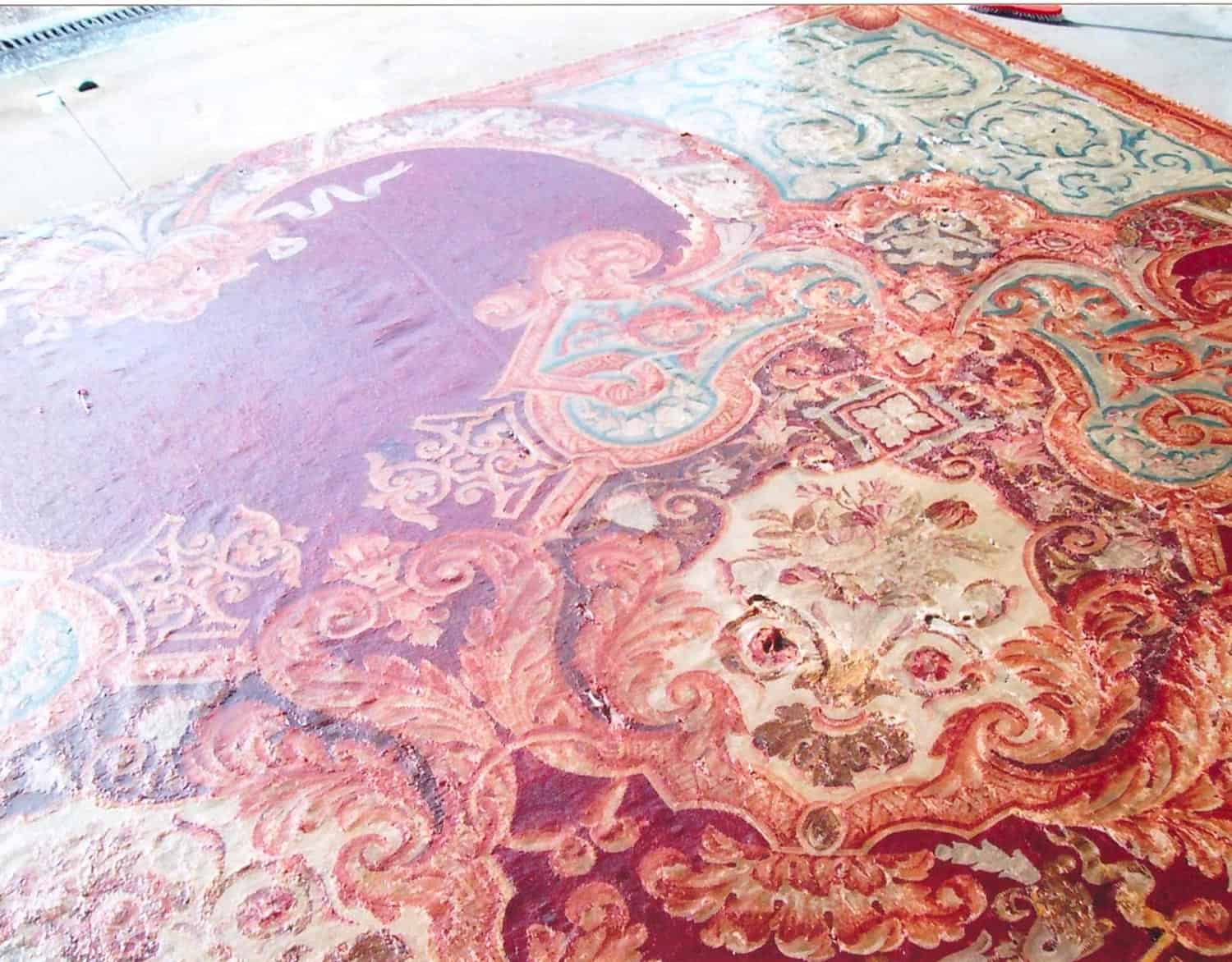 Per preservare il tappeto durante il lavaggio viene cucito a sandwich un tessuto di protezione al fine di creare una struttura più solida che resista alle sollecitazioni. Il manufatto, inserito in apposite vasche create su misura, viene sempre lavorato in piano in modo da non creare trazioni e forze che possano aprire o lacerare i punti che uniscono le varie sezioni. Tutto il processo viene eseguito a mano con capacità ed esperienza dell’operatore usando solo detergenti specifici e acqua trattata.